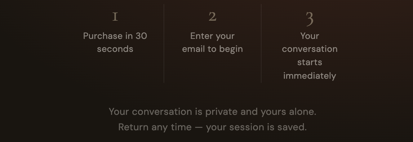 You get a conversation. A long one, probably longer than you expect. The guide asks you questions, and then more questions underneath those questions, the way a good therapist or a trusted friend might. You answer. It listens. It comes back.